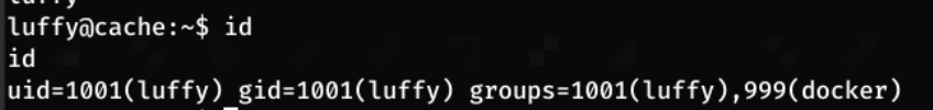 Running id I find that luffy is part of the docker group luffy id
